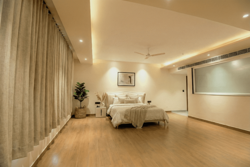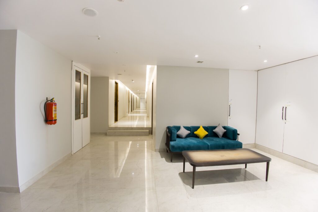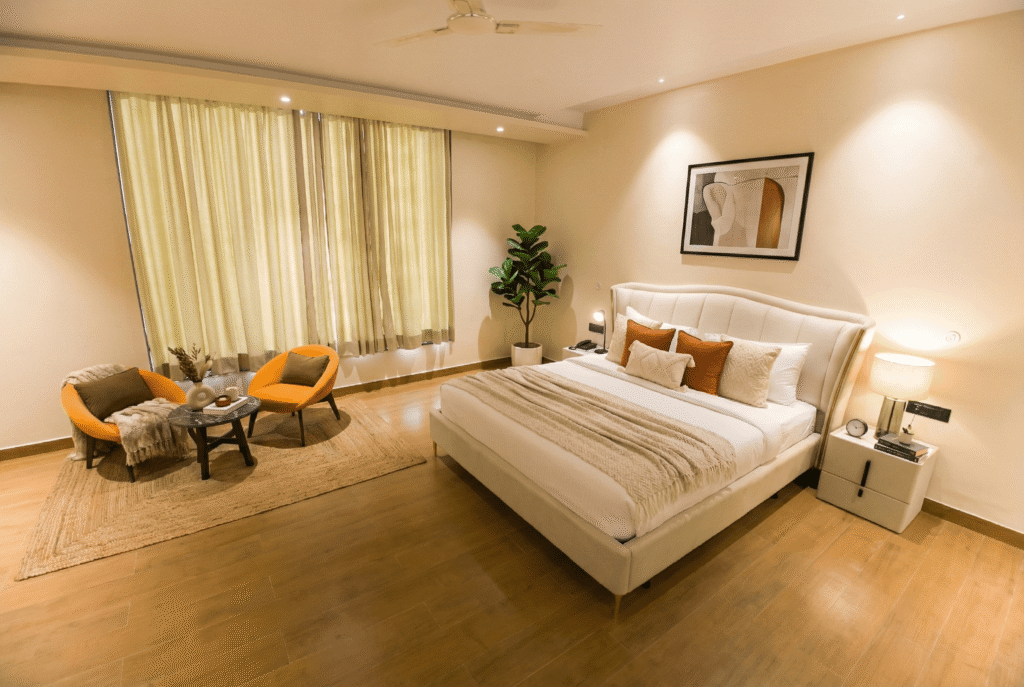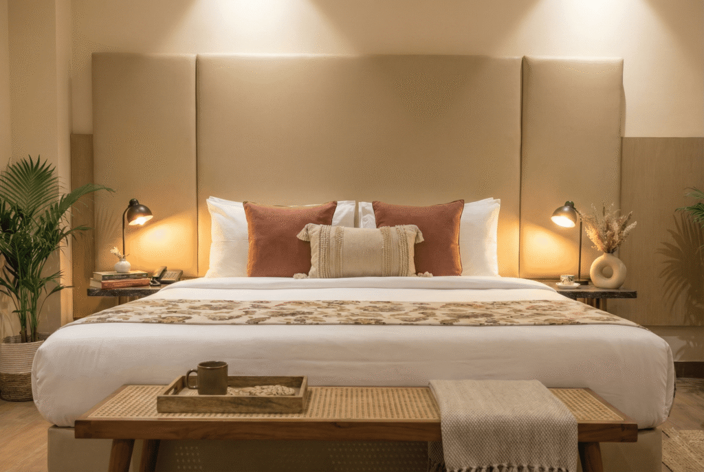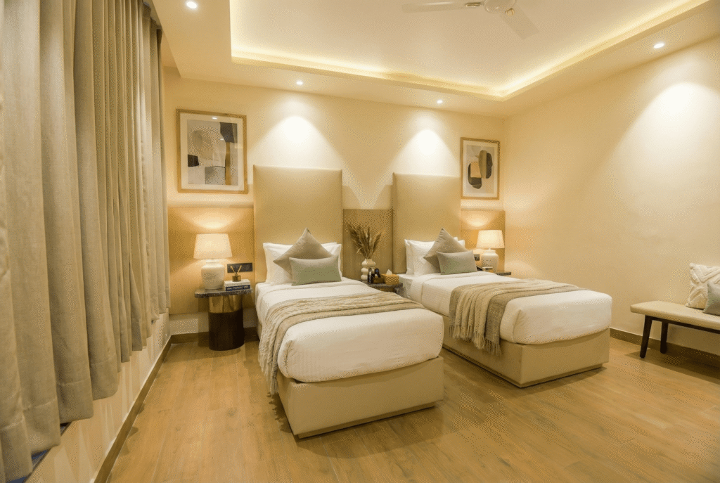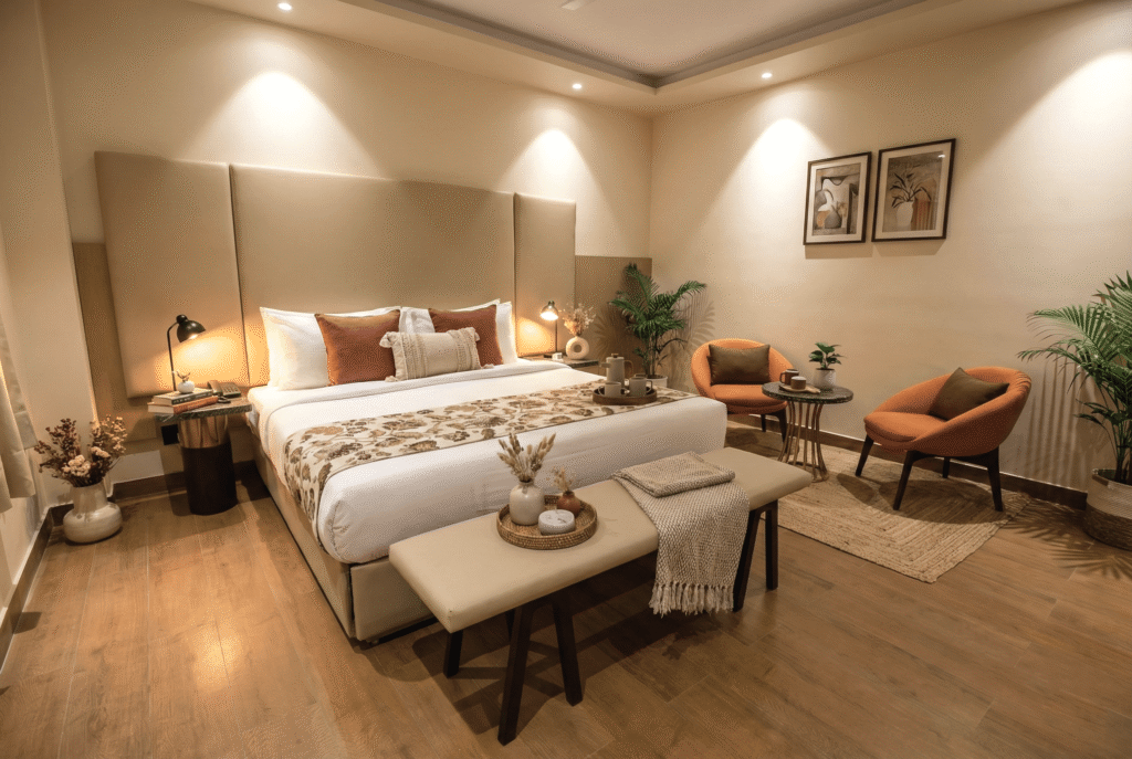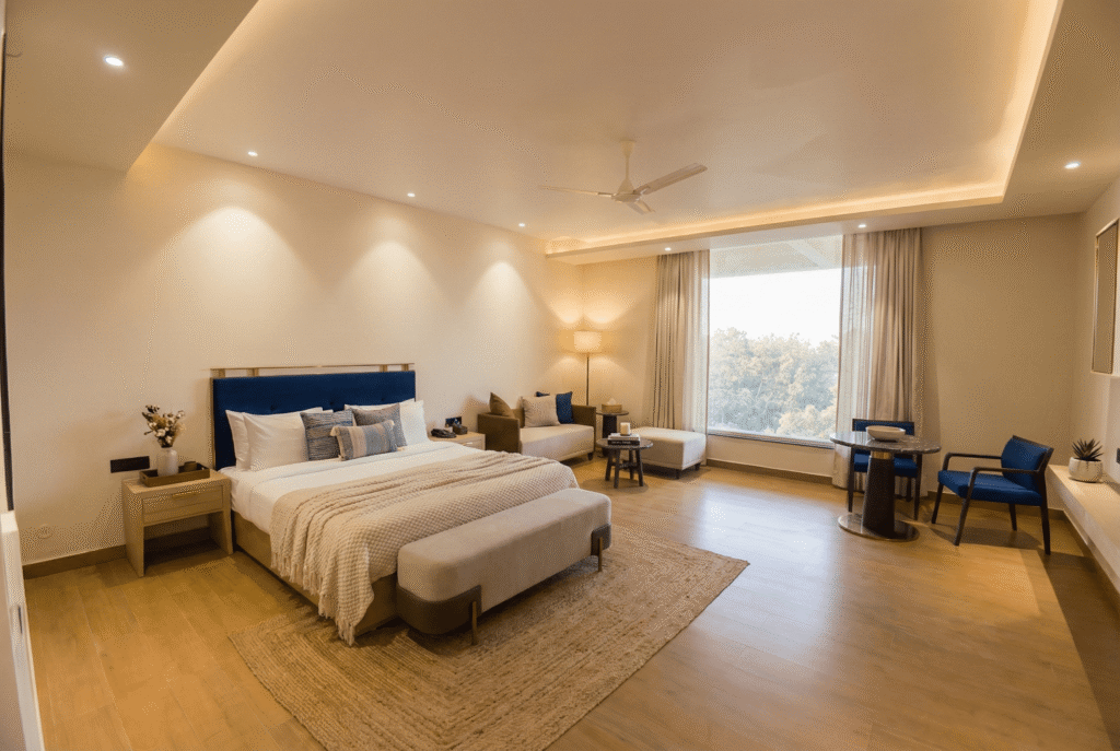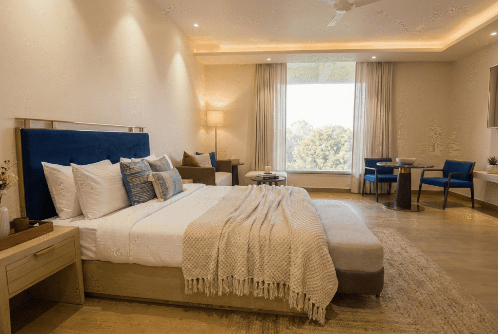 A Deluxe Room is a spacious and comfortable accommodation option, larger than a standard room, designed to offer enhanced comfort and convenience. It typically features a queen- or king-size bed, modern furnishings, a seating or work area, and an en-suite bathroom with quality toiletries. Deluxe Rooms are usually equipped with amenities such as air conditioning, a flat-screen TV, free Wi-Fi, tea and coffee-making facilities, and ample storage space. Often located on higher floor.